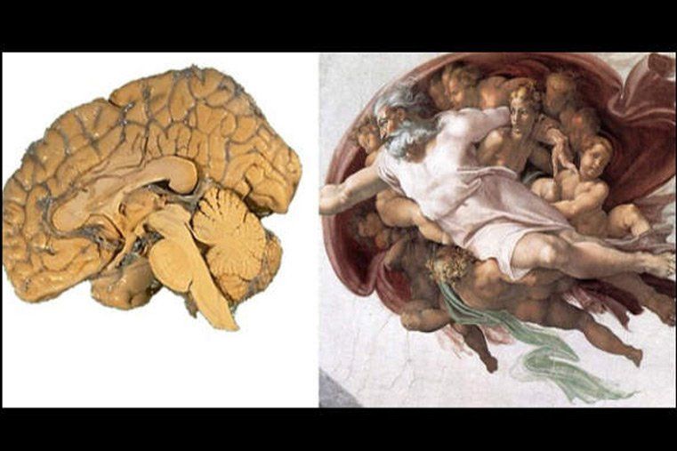 La glándula pineal. Adán apunta con un dedo a Dios, en lo que parece ser una glándula pineal, lo que podría significar un dedo divino pineal tocando neuro eléctricamente a Adán, es decir, un hombre podría acceder a la divinidad, que habita en el cerebro del ser humano.