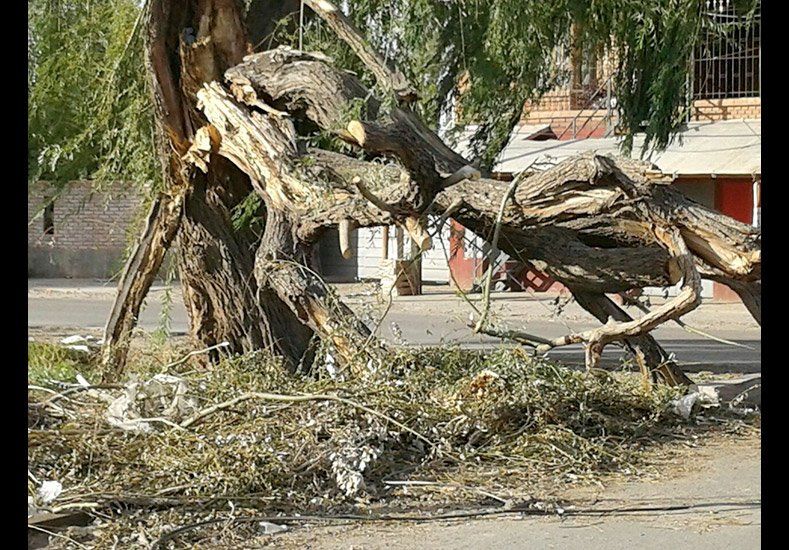 Lo que el viento Zonda no se llevó, quedó evidenciado en General Acha y Progreso, Rawson, en las últimas horas del lunes. Los árboles que habían caído por las fuertes ráfagas que soplaron el sábado 23 de abril continúan en el lugar.