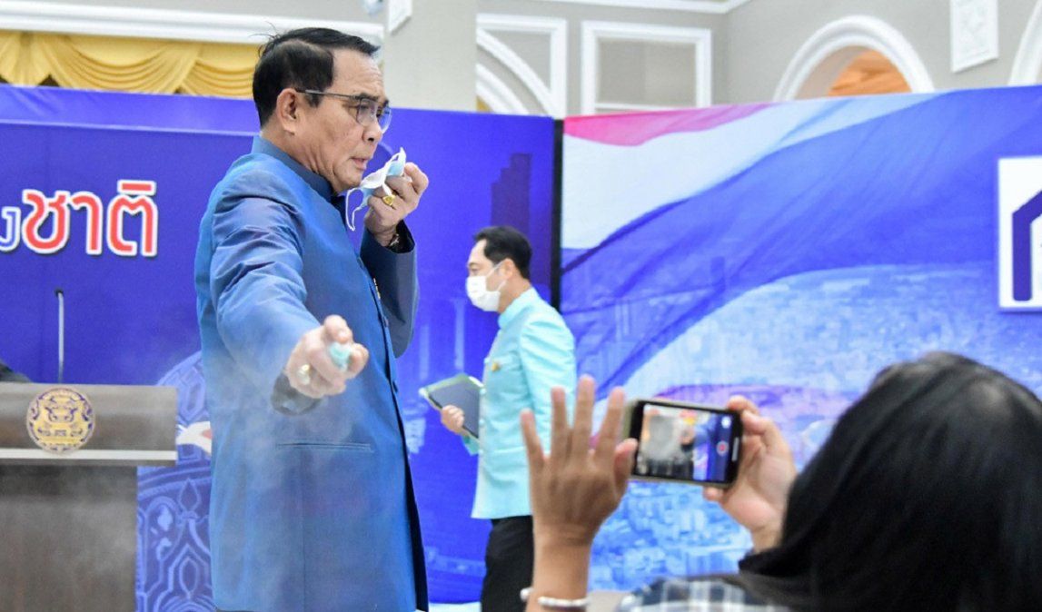El primer ministro de Tailandia, Prayuth Chan-ocha, interrumpió este martes su propia conferencia de prensa para rociar con alcohol de manos a los periodistas en un intento por evitar preguntas incómodas, informa Reuters.