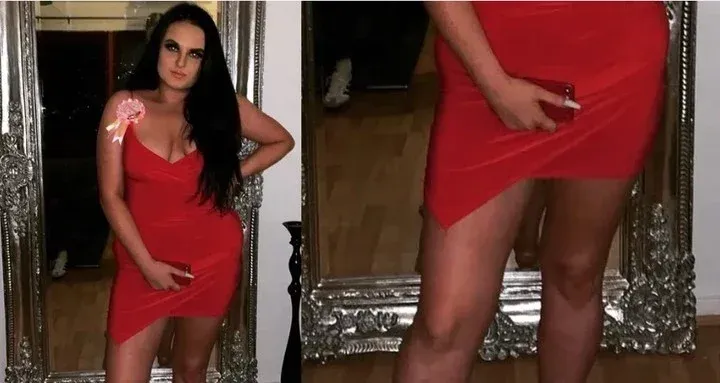 Connie White, de Falkirk, Escocia, posó para la imagen con un vestido rojo y de pie frente a un espejo en su departamento el sábado 17 de octubre. Luego compartió la foto con sus contactos.