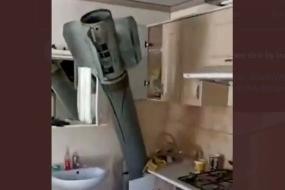 Un misil disparado durante un bombardeo en Ucrania terminó incrustado en la bacha de una cocina en un edificio.