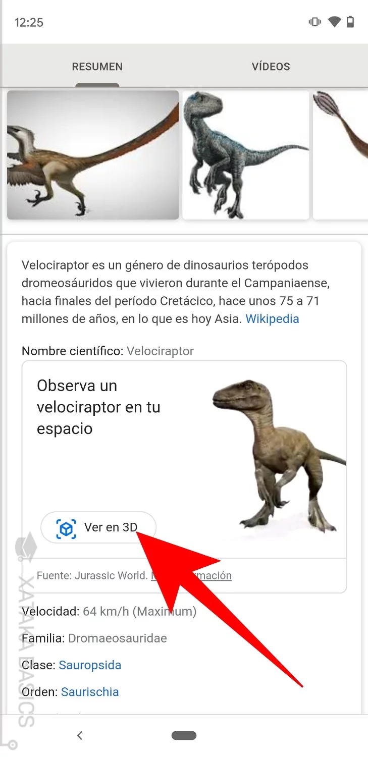 Una vez confirmado esto, hay que escribir en el buscador de Google, a través de la aplicación o de cualquier navegador, "dinosaurio ver en 3D", o directamente el nombre de una de las especies que están disponibles. De ese modo, aparecerá debajo de la búsqueda la nueva opción para poder verlos en una realidad tridimensional.