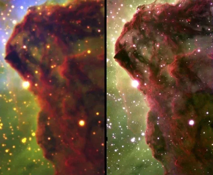 Las imágenes muestran una nube de polvo y gas en la Nebulosa Carina conocida como Muro Occidental. La superficie de la nube se evapora lentamente bajo el intenso resplandor de la radiación de un cúmulo cercano de estrellas jóvenes masivas.