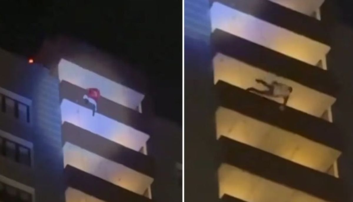 El video se viralizó en la red social X (ex Twitter). En el mismo, se puede ver al hombre intentando trepar el balcón para bajar hacia el vigésimo cuarto piso a través de un cable de seguridad. Sin embargo, no pudo encontrarlo y terminó cayendo desde gran altura.