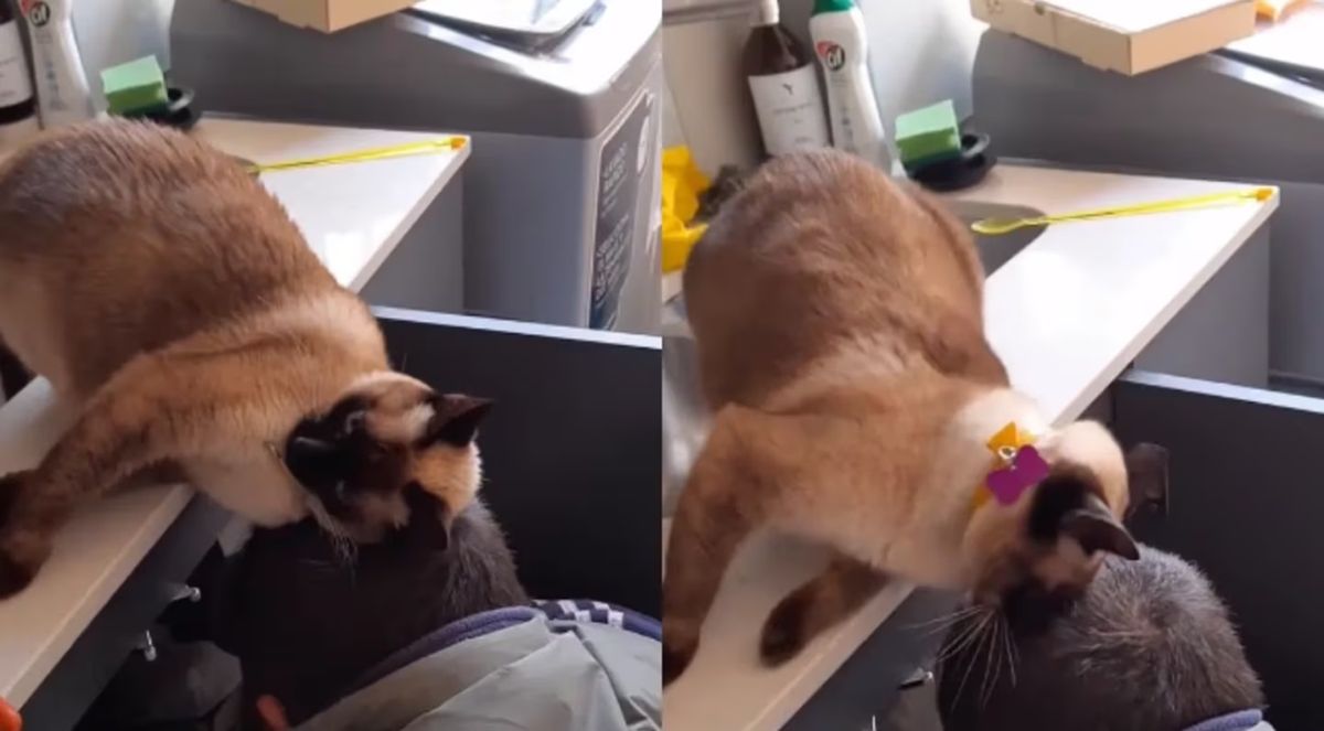 En el clip, compartido por el usuario @franciscocladera, se puede ver al felino trepado a la mesada refregándose con la cabeza del trabajador, quien estaba revisando la tubería de la bacha. Esta acción sirve para que el gato identifique que el objeto con el cual está interactuando es seguro o para marcar su territorio.