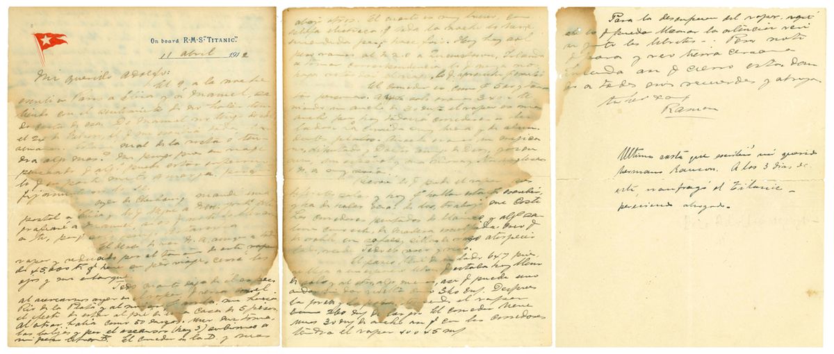 La misiva enviada por Ramón Artagaveytia Gómez, un adinerado empresario agropecuario de 71 años, a su hermano Adolfo fue despachada en la ciudad irlandesa de Queenstown, la última parada de la nave, el 11 de abril del 1912, pocos días antes del naufragio, ocurrido el 15 de abril, detalla la casa Zorrila Subasta.