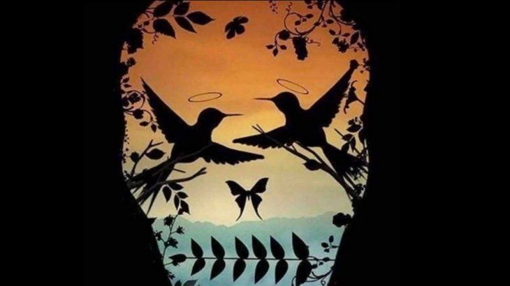 La imagen es de un paisaje visto desde una cueva. En la misma hay cuatro elementos distintivos: dos pájaros, una mariposa, el pasto y una calavera, que se forma con la composición.