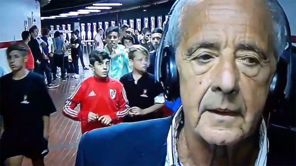 El presidente de River, Rodolfo D'Onofrio, tuvo que resguardarse mientras brindada una entrevista televisiva debido a una aluvión de hinchas que corrían en el anillo interno del estadio Monumental.
