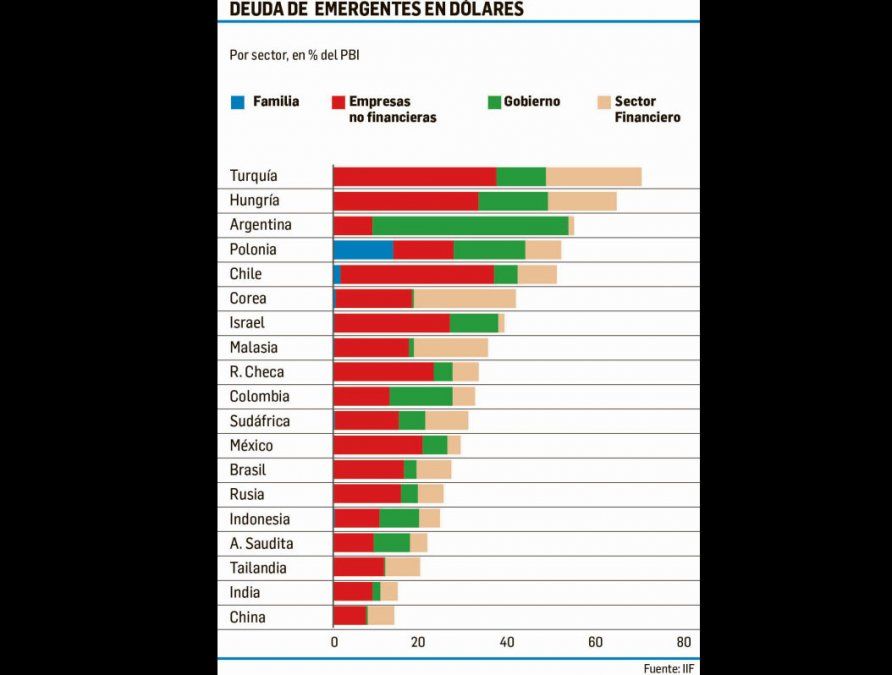 Para tener una dimensión del nivel de endeudamiento en moneda extranjera en los mercados emergentes (familias y empresas no financieras) basta con mencionar que en el primer trimestre de 2018 alcanzó un aumento récord de$ 5,5 billones (el 78% de empresas no financieras). "Dada su alta dependencia de la deuda nominada en moneda extranjera, Argentina, Hungría, Turquía, Polonia y Chile parecen ser los más vulnerables a grandes oscilaciones en los flujos de capitales", afirma el IIF.