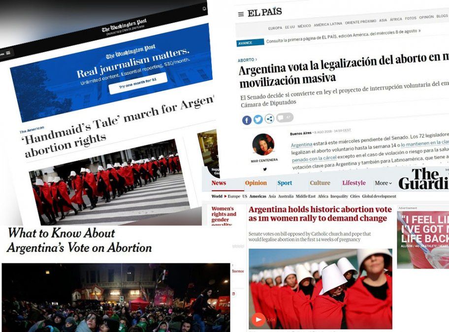 The Washington Post utiliza para su título una obra de la escritora Margaret Atwood, Handmaid's Tale para decir "El cuento de la criada marcha en Argentina por el derecho al aborto" ya que un grupo de mujeres hizo frente al Congreso una representación vestidas con la ropa que usan las criadas obligadas a embarazarse en la serie para reclamar por la despenalización. La marcha tuvo lugar la semana pasada, y por entonces el Post contaba que la Cámara de Diputados había aprobado la legalización de la interrupción del embarazo hasta 14 semanas. Y contaba que este miércoles la votación será en el Senado. "El presidente Mauricio Macri ha dicho que si bien él se opone al aborto, no vetará la ley que se apruebe".