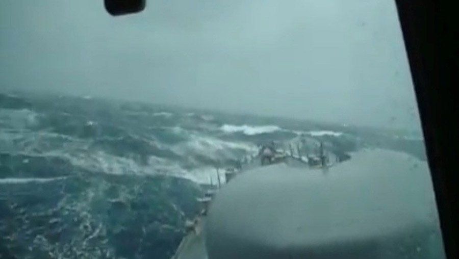 Las imágenes fueron tomadas desde el Destructor ARA "Sarandí", que debe sortear olas de más de seis metros de altura. Las condiciones meteorológicas mejorarían recién mañana.