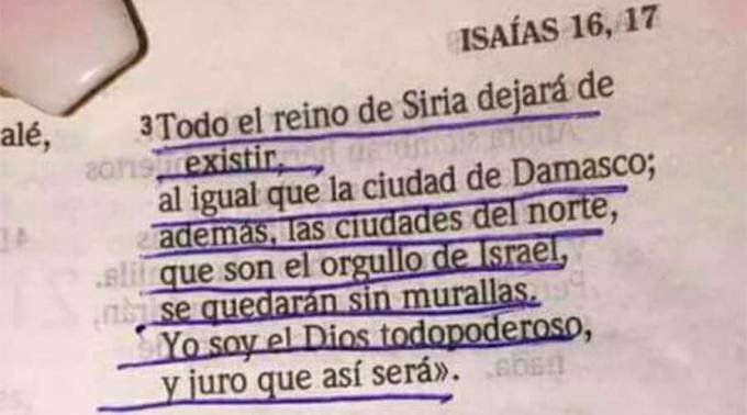 La cita difundida con una foto en las redes sociales recoge el versículo 3, del capítulo 17 del Libro de Isaías: "Todo el reino de Siria dejará de existir, al igual que la ciudad de Damasco; además, las ciudades del norte, que son el orgullo de Israel, se quedarán sin murallas. Yo soy el Dios todopoderoso y juro que así será".