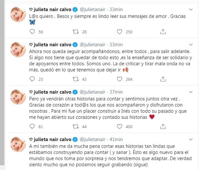 Y en su cuenta de Twitter, Julieta Nair Calvo manifestó: "A mi también me da mucha pena cortar esas historias tan lindas que estábamos construyendo para contar ( y sanar ). Ésto es algo nuevo para el mundo que nos toma por sorpresa y nos tendremos que adaptar. De verdad siento mucho que no podamos seguir grabando..."