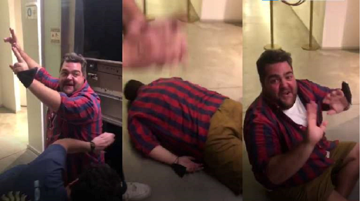 En el video se lo ve al técnico agarrando de los brazos al conductor para que pueda salir por el espacio que quedó entre el piso del edificio y el ascensor. Una vez que logra pisar tierra firme, el humorista festejó y se tiró en el piso del pasillo.
