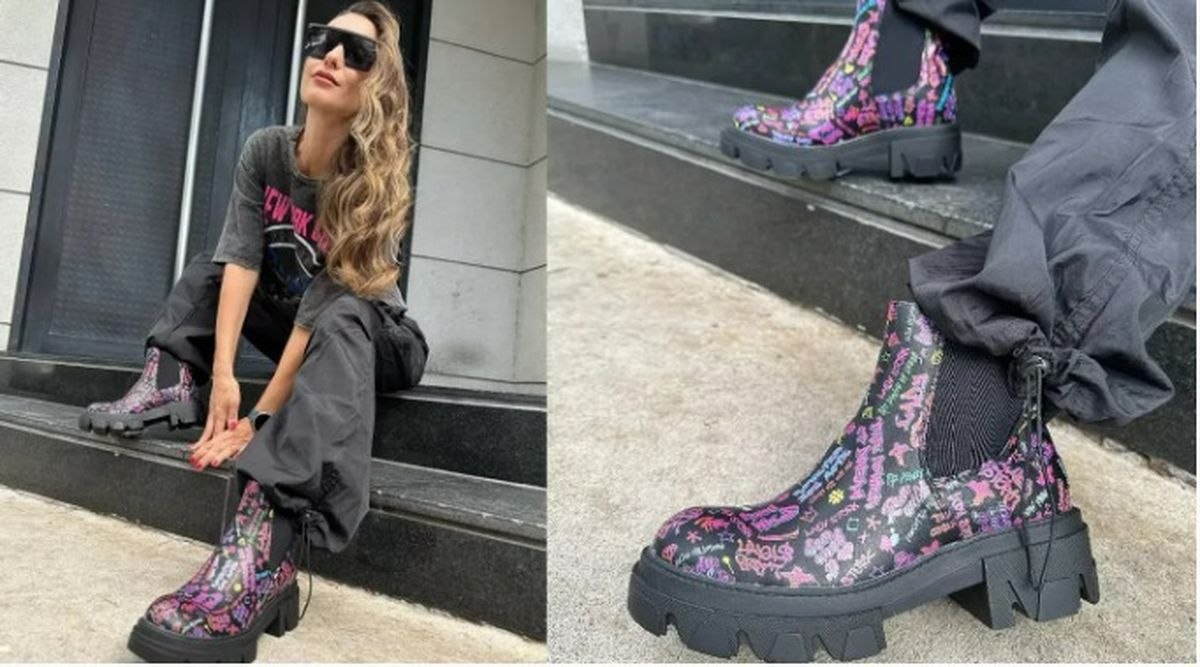 En su caso, la modelo llevó estos pantalones de una forma muy canchera, ya que decidió combinarlos con una remera crop estampado con mangas maxi y unas botas que causaron sensación.