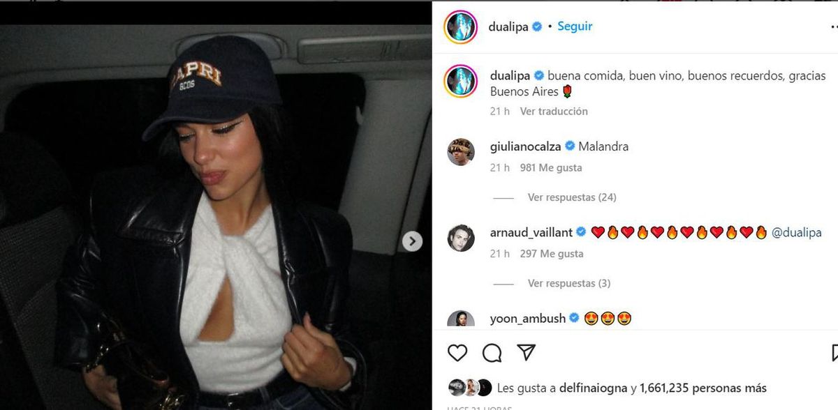 Como agradecimiento a los fans, la cantante inglesa dejó un mensaje de despedida en sus redes sociales. “Buena comida, buen vino, buenos recuerdos, gracias Buenos Aires”, escribió Dua Lipa junto a distintas fotos de su paso por el país.