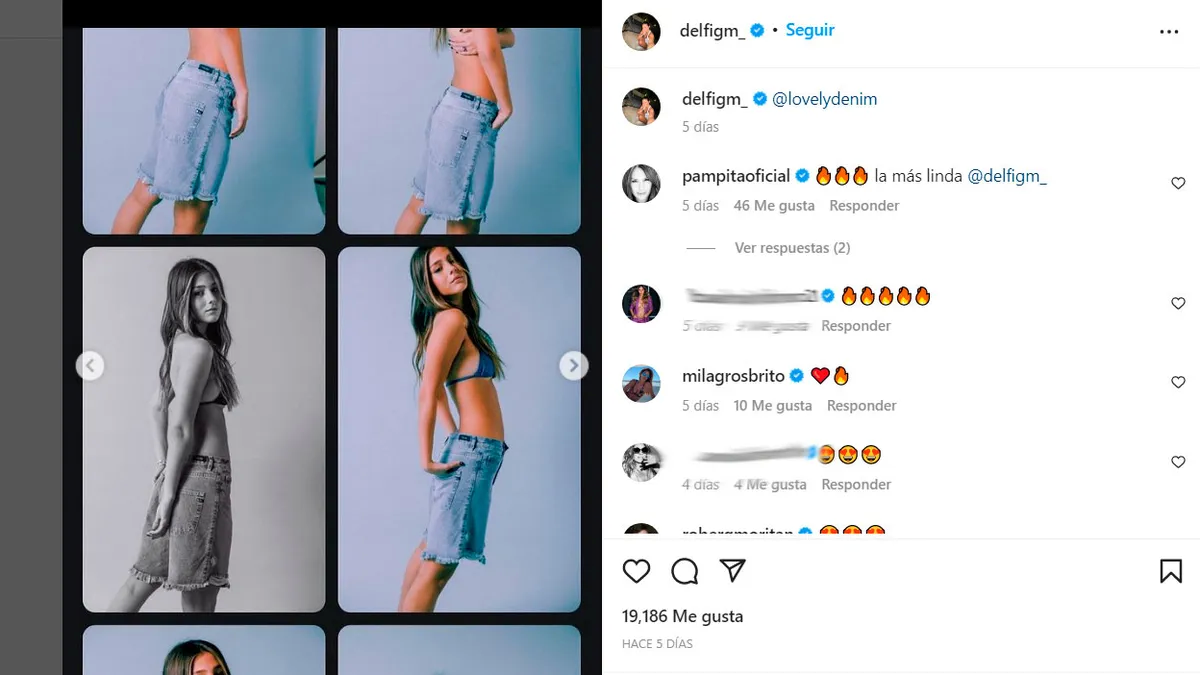 Delfina posteó en Instagram las fotos de la producción que protagonizó para la marca de ropa de nada menos que la nieta de Susana Giménez, Lucía Celasco. Y, la ex de Benjamín Vicuña no dudó en dar su visto bueno. "La más linda", le comentó Pampita, muy cariñosa, junto a un montón de emojis de fueguitos.