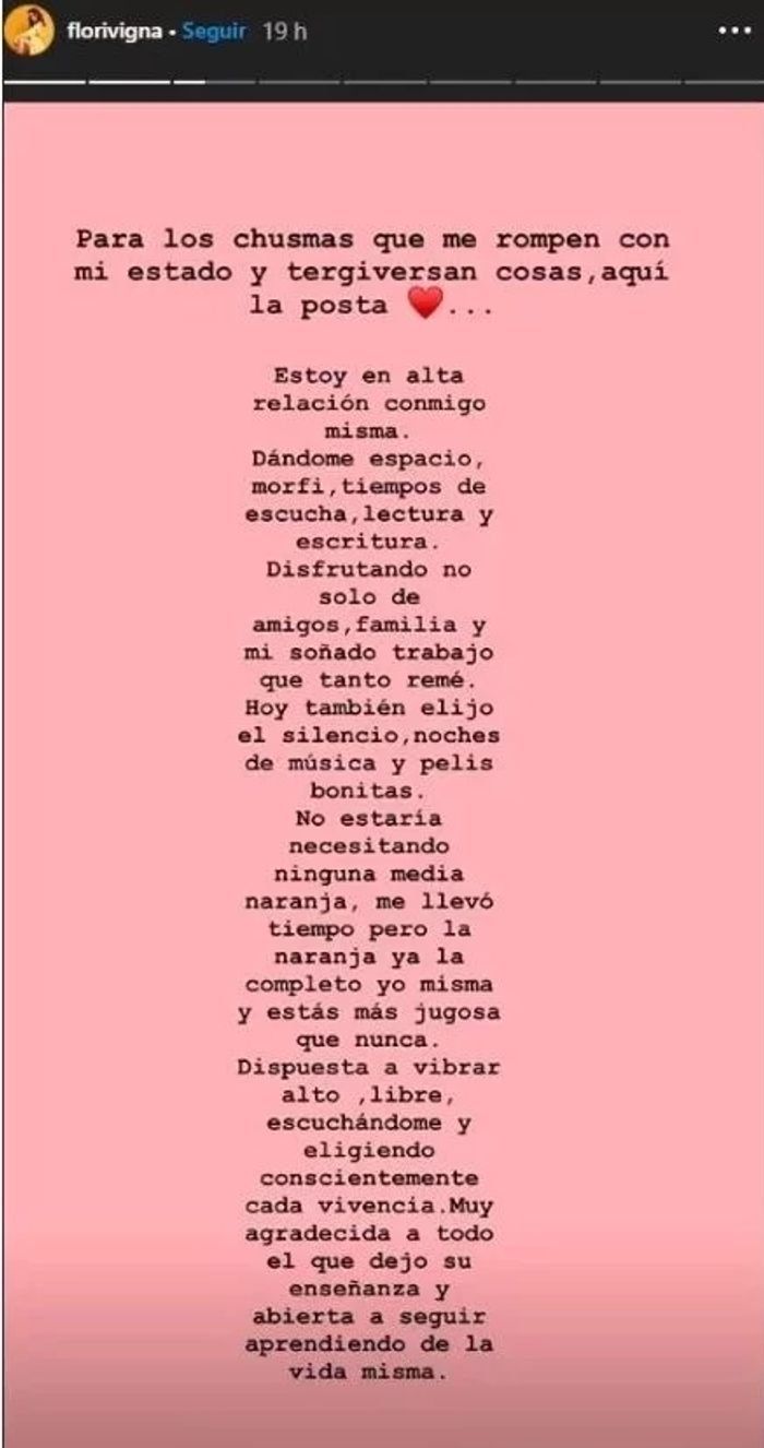Los trascendidos de relación con el cantante surgieron hace unos días y ahí Flor hizo un descargo desde las redes.