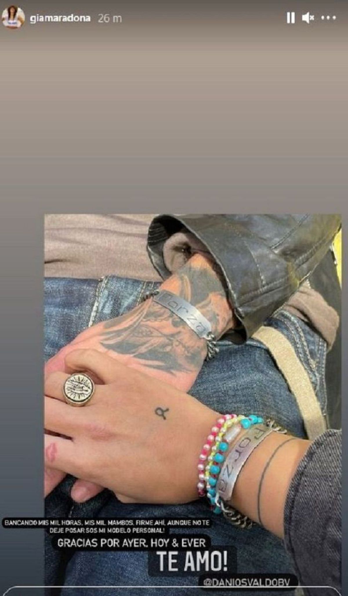 Y luego, con una imagen de las manos de ambos (en la que se observa que tienen la misma pulsera) le hizo una romántica declaración: "Bancando mis mil horas, mis mil mambos, firme ahí. Aunque no te deje posar sos mi modelo personal".