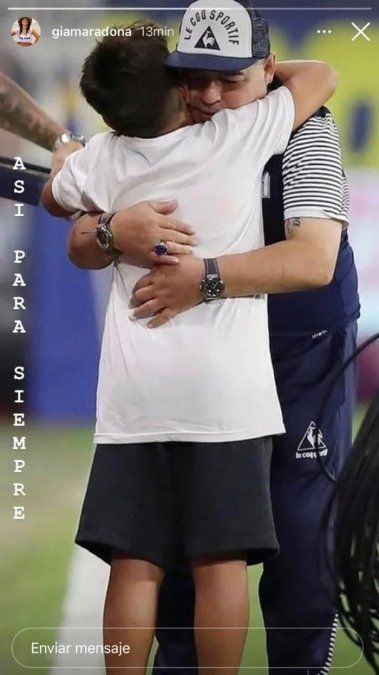 Y en las últimas horas, a través de sus stories, Gianinna Maradona compartió un tierno recuerdo; una foto en la que se ve a su hijo abrazando a más no poder a Diego en plena cancha.