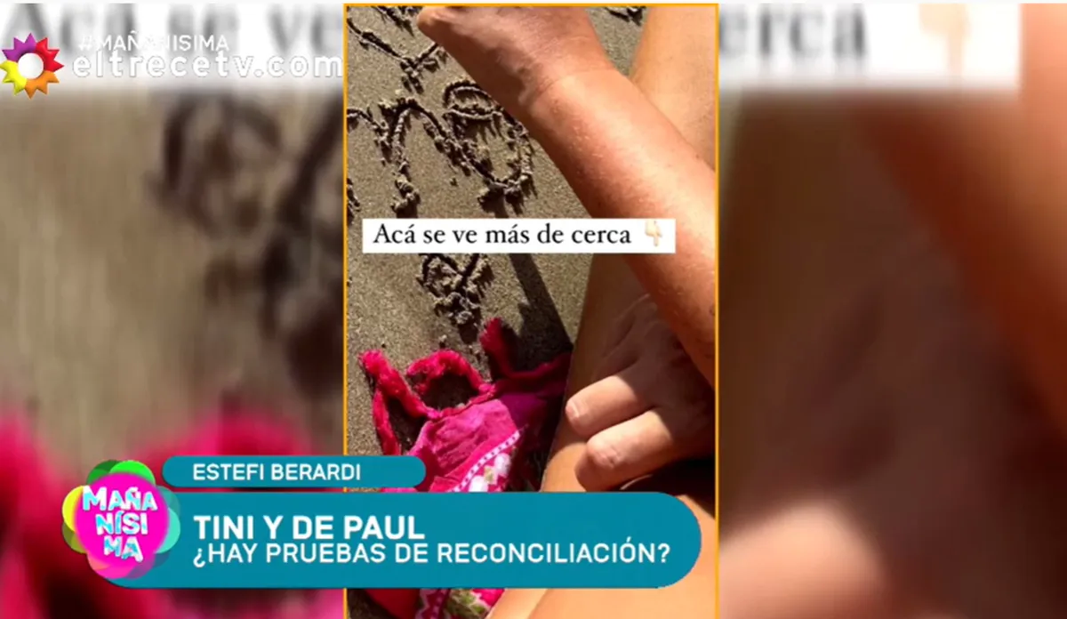 “Ayer estaba mirando Instagram y veo que Tini subió un carrusel de fotos. Empiezo a mirar y veo una imagen de la playa donde está escrito en la arena ‘Tini te amo’. Lo que me llamó la atención es que se ve claramente la mano de un varón en su pierna. Yo estoy segura que estos nudillos más grandes son de hombre”, remarcó la panelista.