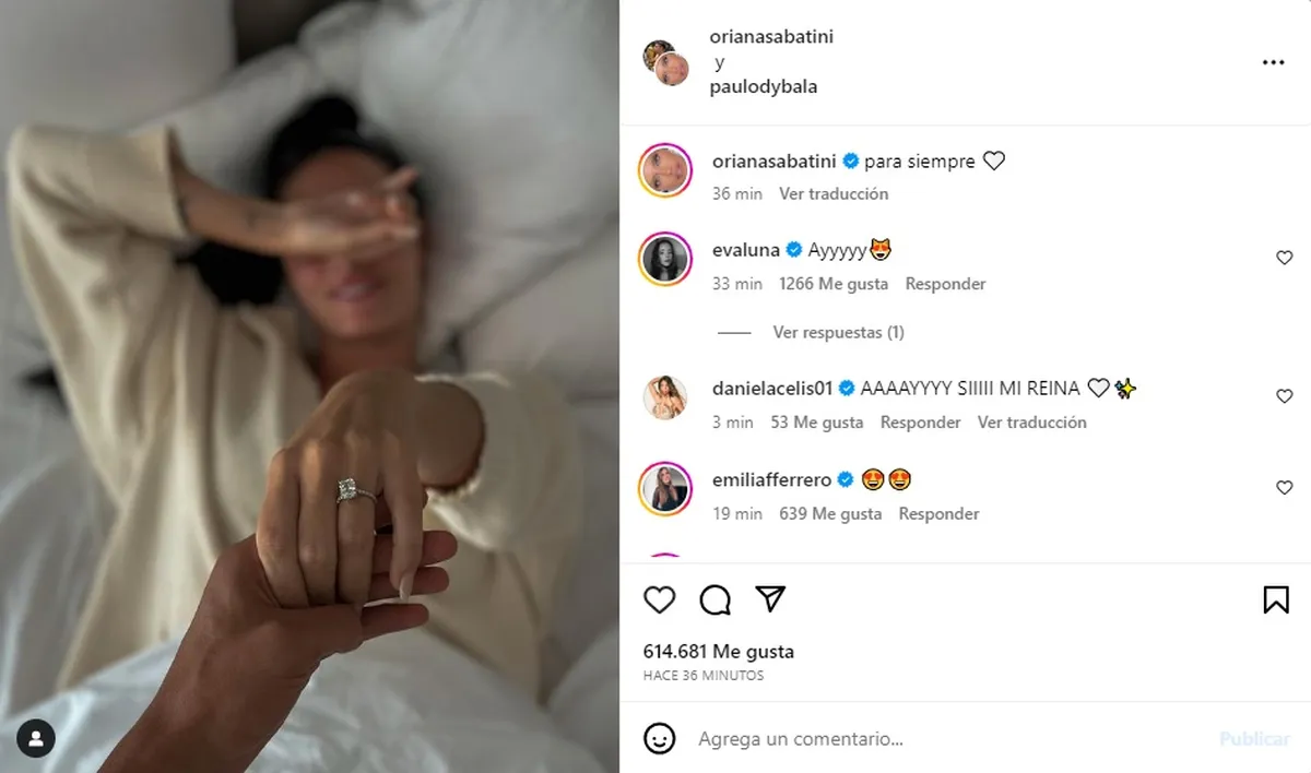 Claro que en la imagen que acompañó la escueta frase, puede ver a Sabatini recostada en la cama, tapándose la cara con una mano y la otra extendida, tomada de la de Dybala, luciendo el hermoso anillo de compromiso con una delicada piedra preciosa.