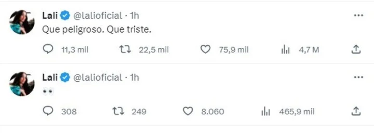 Si bien no menciona en ningún momento al libertario ganador de las Primarias, Abiertas, Simultáneas y Obligatorias, el mensaje tiene un claro destinatario. "Qué peligroso. Qué triste", escribió Lali en la red social Twitter.