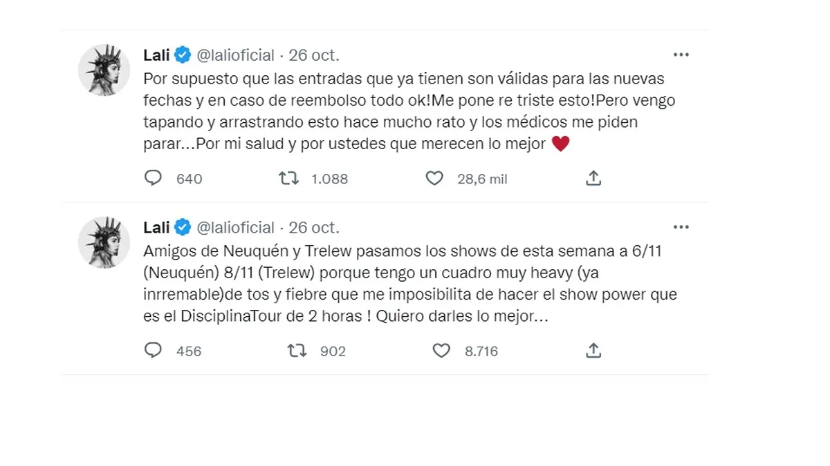 "Pasamos los shows porque tengo un cuadro muy heavy (ya irremable) de tos y fiebre que me imposibilita de hacer el show power que es el DisciplinaTour de 2 horas", explicó la artista en Twitter.