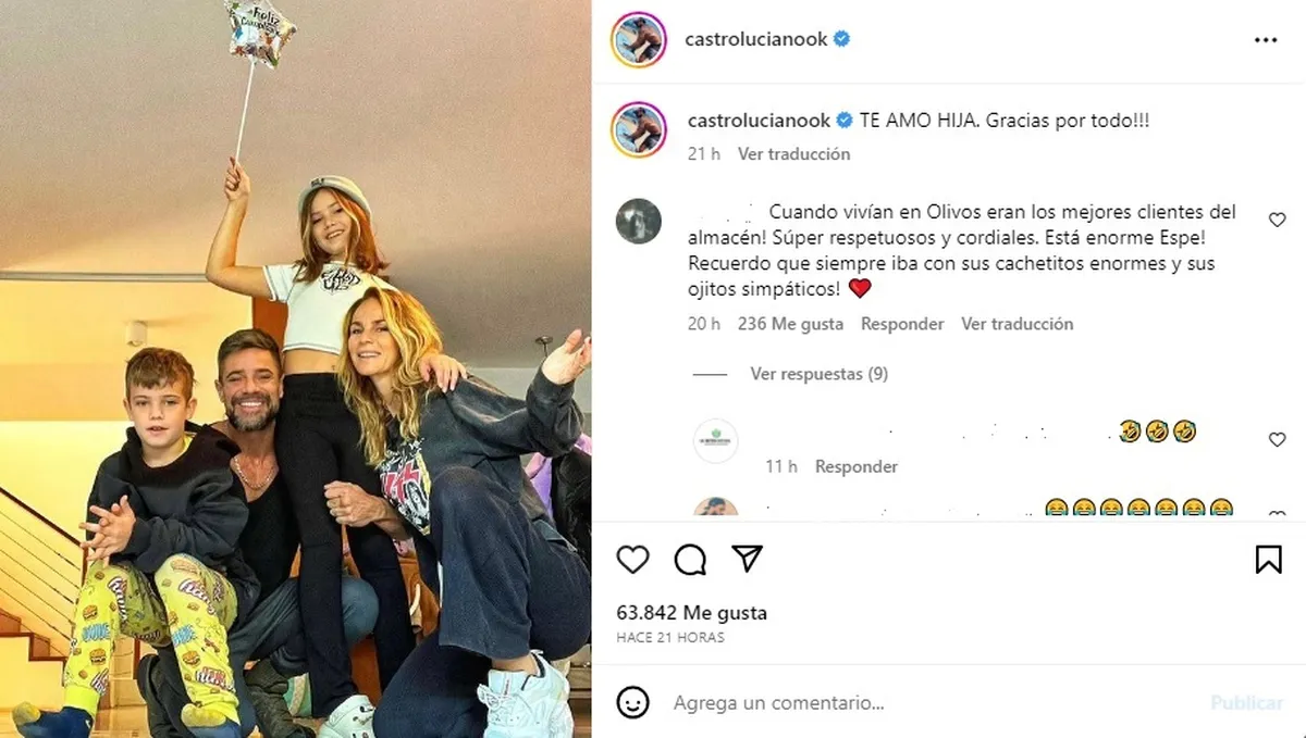En tanto, un rato más tarde el actor no dudó en subir a su feed de la red social la misma postal abrazado a sus hijos y su ex mujer, donde volvió a saludar a Espe -como la llaman cariñosamente-. "Te amo hija, gracias por todo!!!" escribió Luciano, tras el video que había compartido abrazado junto a la nena sobre el escenario, donde reflejó sus sentimientos hacia la menor de la familia: "Mi gorda linda ya tan grande".
