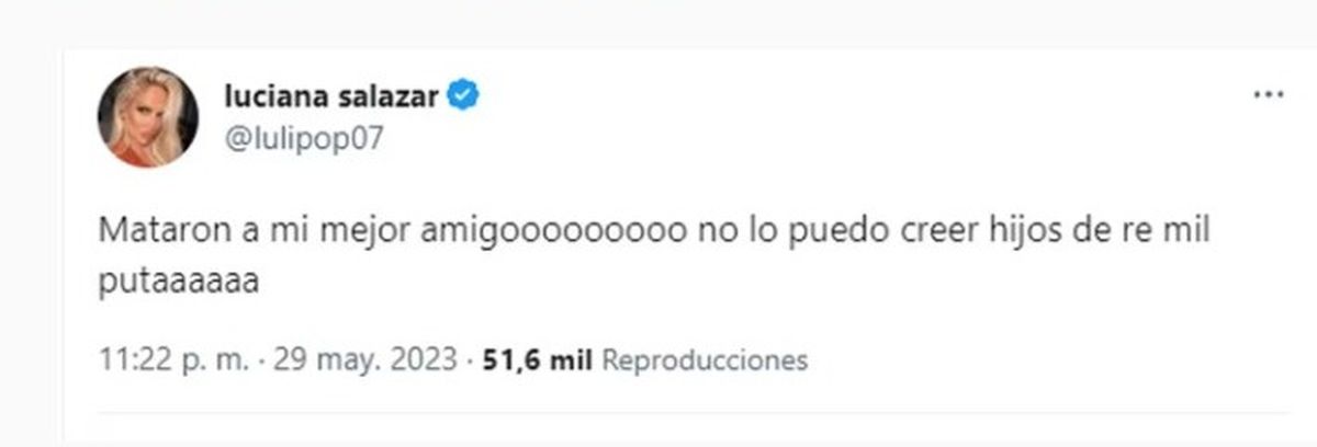 Este lunes, minutos antes de la medianoche, Luciana Salazar publicó un doloroso mensaje en su cuenta de Twitter. “Mataron a mi mejor amigo, no lo puedo creer hijos de re mil puta”, lanzó tras conocer la triste noticia de la muerte de Charles Raúl Sotelo, estilista y dueño de las barberías Bacan.
