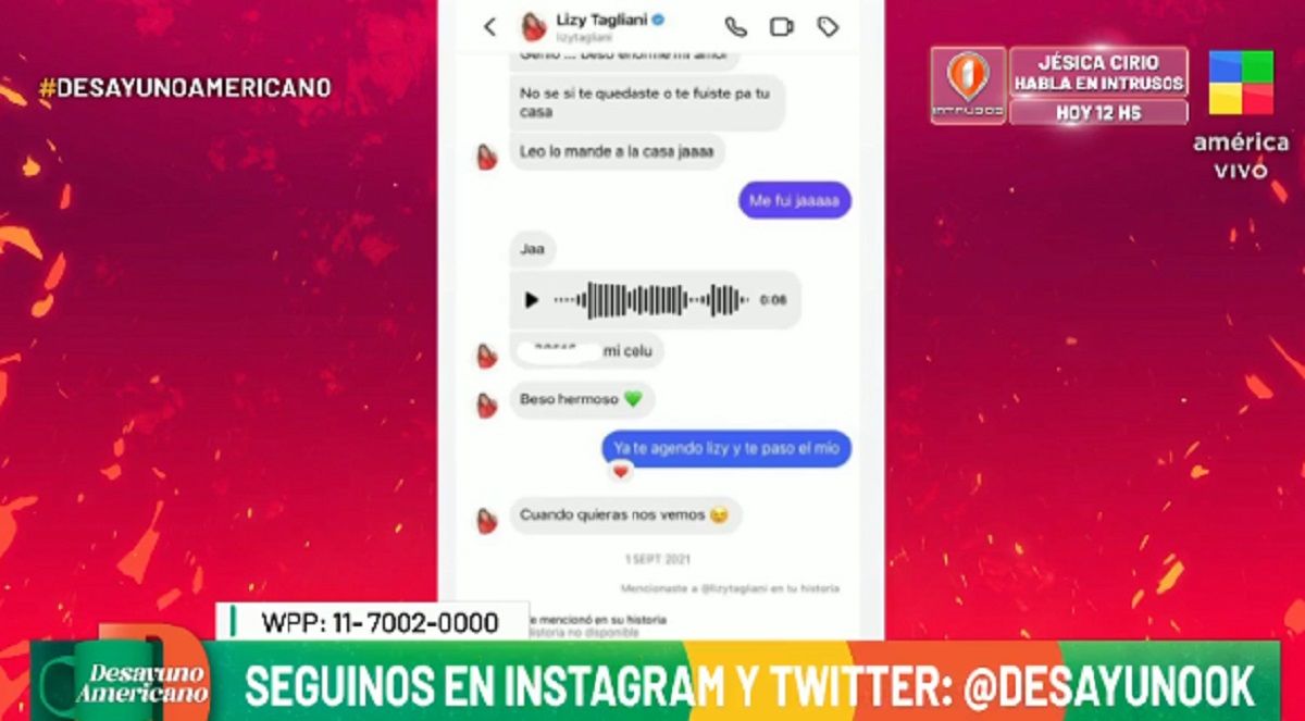 "No sé si te quedaste o te fuiste pa tu casa. A Leo lo mandé a casa", se lee que le dice la figura de Telefe a Martín en ese intercambio de mensajes. Eneseguida, ella le pasa su teléfono y se despide con mucho afecto: "Beso, hermoso".