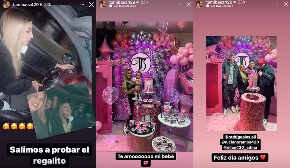 Siempre con Jamaica a upa, Tamara Báez mostró desde sus historias virtuales la cuidadosa ambientación del festejo en la gama de los rosas y lilas. Desde allí, además de mostrar toda su alegría les deseó un feliz día a sus amigos.