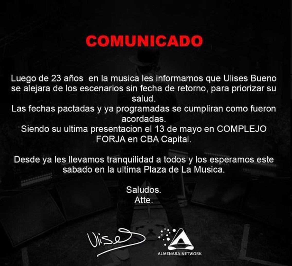 El representante del cantante de cuarteto Ulises Bueno, Ariel Cappozucca, informó hoy que el vocalista "está bien, con asistencia psicológica", tras anunciar que se bajaba del escenario de manera indefinida.