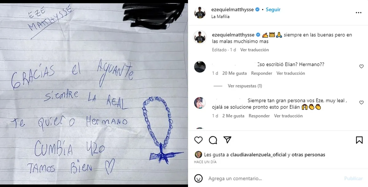 “Gracias el aguante, siempre la real” puede leerse en el escrito de puño y letra de Elián. Al tiempo que agregó su demostración de gratitud con un “Te quiero hermano. Cumbia 420″.