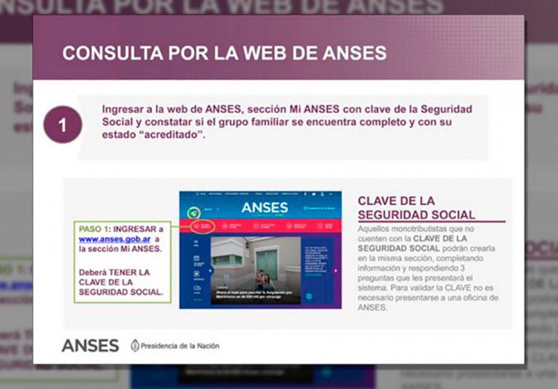 Montos a percibir según la categoría a la que corresponda el trabajadorLuego de que se informara esta modificación, el Gobierno publicó un instructivo para que aquellos que estén inscriptos en el régimen del monotributo puedan acceder al cobro de este ingreso.Antes que nada, los trabajadores deben corroborar que cuentan con sus datos personales y los de su grupo familiar acreditados correctamente en la Anses. Esta consulta debe hacerse a través de la web.1) Ir a la sección Mi ANSES. Ingresar el CUIL y la Clave de la Seguridad Social. Si no se cuenta con la clave, se la puede generar allí mismo, completando información y respondiendo 3 preguntas sin necesidad de presentarse personalmente.2) Una vez ingresado a Mi ANSES, hacer clic en el ícono de Relaciones Familiares.3) Completar los datos de domicilio particular, teléfono de contacto y dirección de email.4) Revisar si los datos personales y del grupo familiar se encuentran completos, correctos y si se encuentran en estado "acreditado".5) Si los datos están debidamente acreditados, ingresar en la solapa gestión/cambio de boca de pago AAFF. Si desea modificar la boca de pago pulsar continuar e ingresar el nuevo CBU para recibir el pago.En caso de que no estén acreditados, deberán presentarse a una oficina de la ANSES sin turno previo con la siguiente documentación: original y fotocopia de los DNI de ambos progenitores e hijos, partida de nacimiento original y fotocopia, constancia de CBU emitida por banco, donde consten el DNI, número de CBU y apellido y nombre del titular.