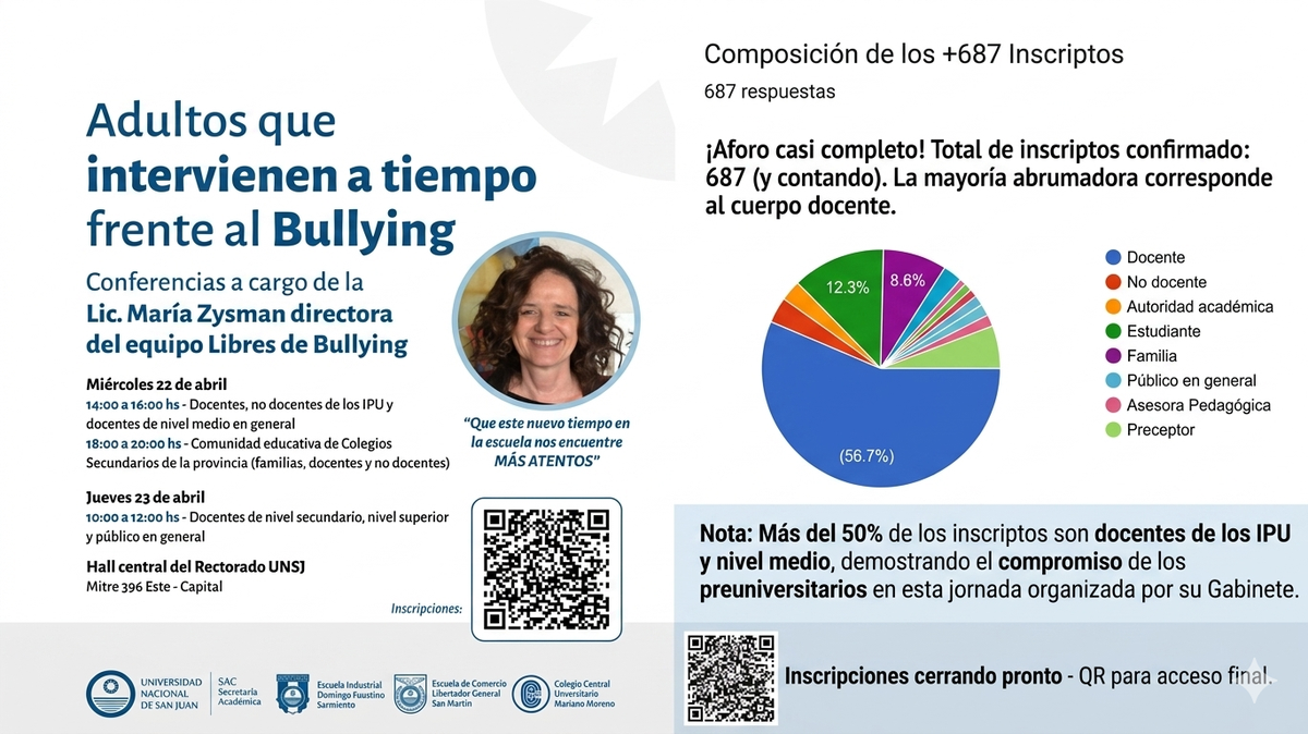 La provincia recibe este miércoles a la Lic. María Zysman, directora del equipo "Libres de Bullying", para encabezar un ciclo de conferencias titulado "Adultos que intervienen a tiempo frente al Bullying". La iniciativa, organizada por el gabinete de las escuelas preuniversitarias (IPU) de la Universidad Nacional de San Juan, generóuna respuesta masiva por parte de la comunidad educativa.