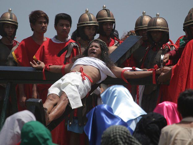 El pintor de letreros, Ruben Enaje, de 53 años, se clavó por 28vo año en una cruz en un montículo polvoso en la aldea de San Pedro Cutid, en Pampanga. Efectúa su rito cada año después de que sobreviviera a una caída en un edificio.
