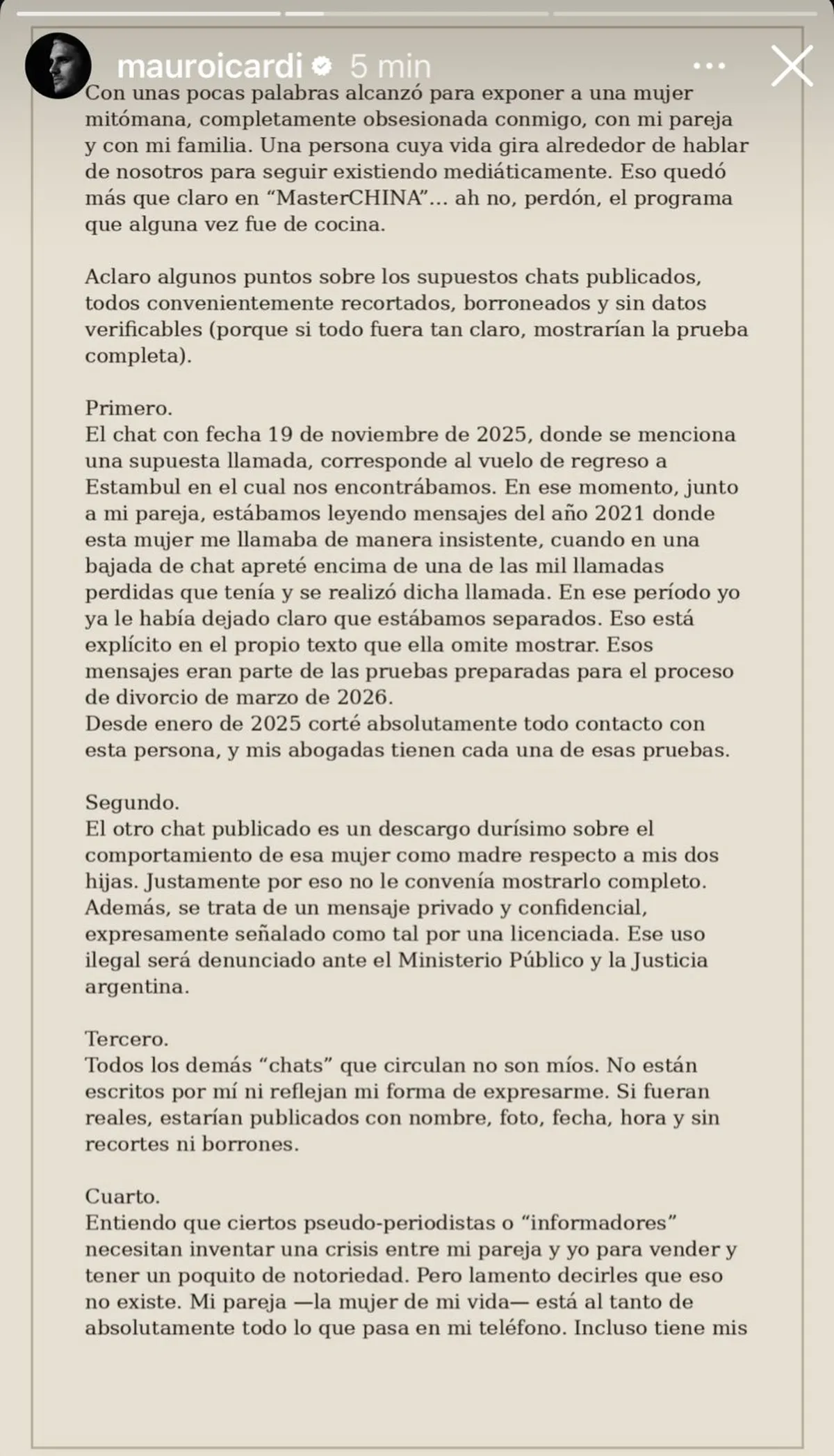 "Primero. El chat con fecha 19 de noviembre de 2025, donde se menciona una supuesta llamada, corresponde al vuelo de regreso a Estambul en el cual nos encontrábamos. En ese momento, junto a mi pareja, estábamos leyendo mensajes del año 2021 donde esta mujer me llamaba de manera insistente, cuando en una bajada de chat apreté encima de una de las mil llamadas perdidas que tenía y se realizó dicha llamada. En ese período yo ya le había dejado claro que estábamos separados. Eso está explícito en el propio texto que ella omite mostrar. Esos mensajes eran parte de las pruebas preparadas para el proceso de divorcio de marzo de 2026. Desde enero de 2025 corté absolutamente todo contacto con esta persona, y mis abogadas tienen cada una de esas pruebas", disparó.