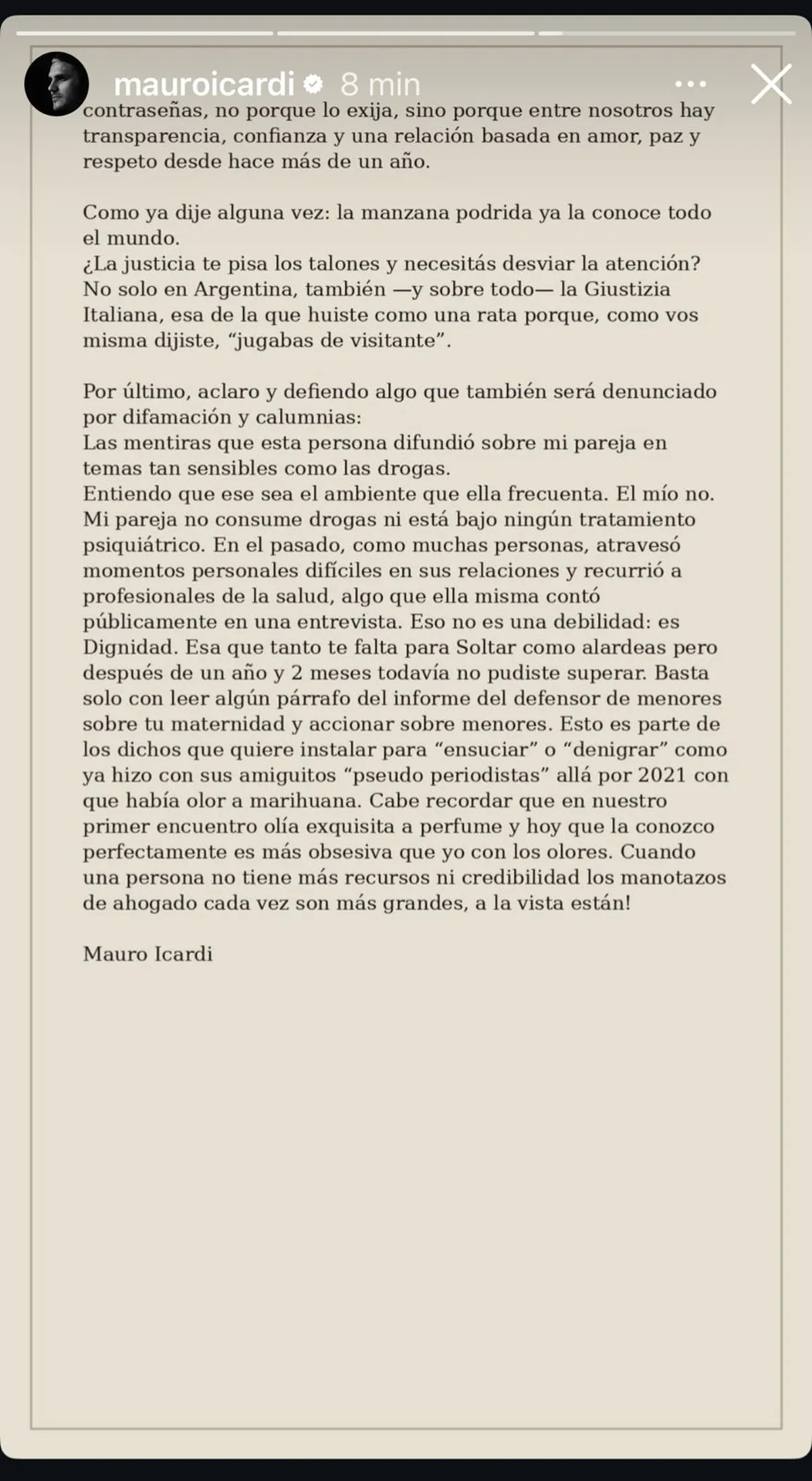 Icardi, además, cerró el posteo anunciando que denunciará a Wanda por difamación y calumnias. "Las mentiras que esta persona difundió sobre mi pareja en temas tan sensibles como las drogas. Entiendo que ese sea el ambiente que ella frecuenta. El mío no", aseguró.