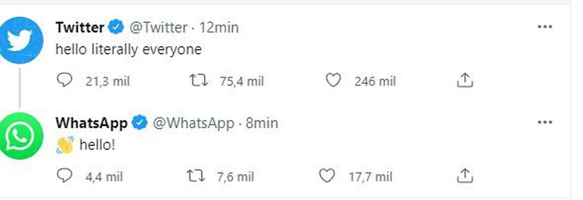 Mientras tanto, los usuarios de todas las plataformas se descargan en Twitter y Twitter aprovecha la ocasión. Con humor, WhatsApp le contestó por su cuenta oficial. “Hola literalmente a todos”, escribió @Twitter y @whatsapp le respondió con una manito saludando.