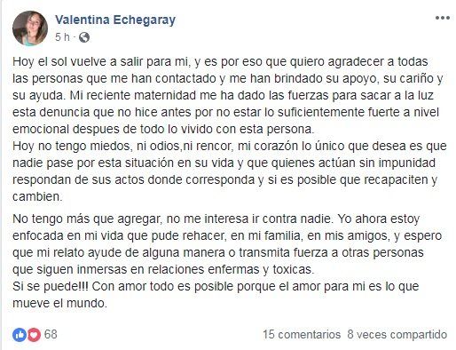 Valentina Echegaray, exnovia de Federico Amín, volvió a utilizar las redes sociales luego de las graves acusaciones que realizó el último jueves en su cuenta de Facebook.