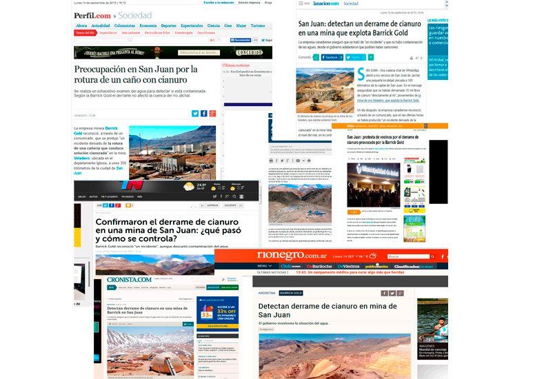 En los principales portales online se pueden ver los artículos relacionados con la información del derrame de solución cianurada en la mina ubicada en Jáchal. En todos destacan que no habría problemas con el agua, tal como los informa Barrick a través de su comunicado.