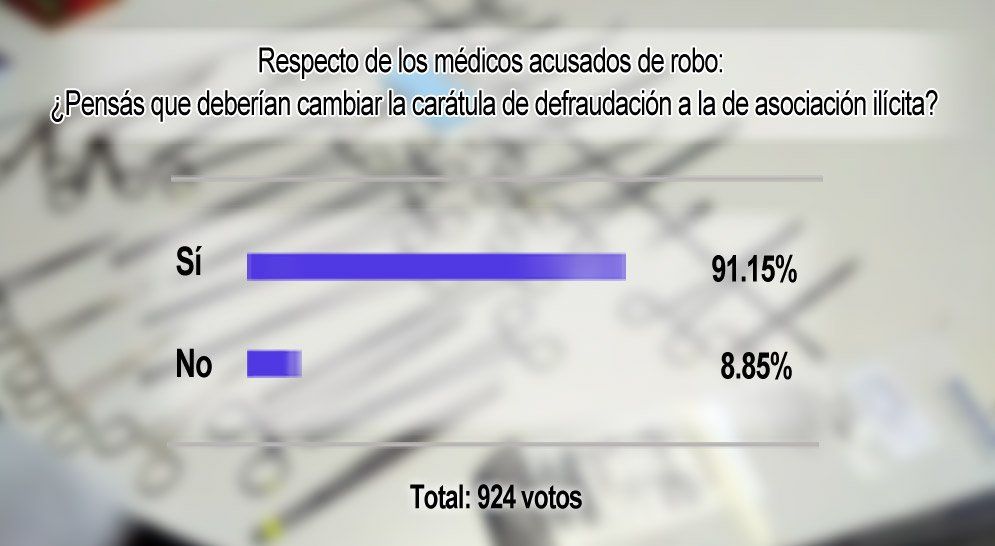 Hasta el momento la carátula de la causa es Defraudación y Estafa, cuya pena máxima es de seis años, pero podría cambiar a Asociación Ilícita, que de comprobarse, la condena máxima es a 10 años. Esto es lo que exige la sociedad sanjuanina, para aquellos que se llevaron el material que pertenecía a la salud pública, para introducirla en la parte privada.