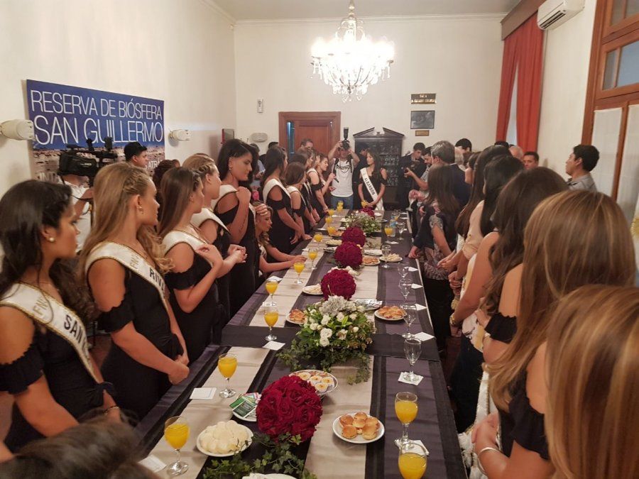 Las jóvenes, representantes de los diecinueve departamentos, se presentaron ante la primera autoridad provincial, Sergio Uñac, quien las recibió y agasajó con un desayuno en la sala Ricardo Colombo.