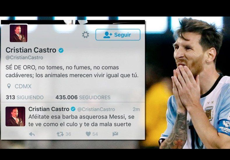 Cristian Castro siguió minuto a minuto la final de la Copa América Centenario que disputó el seleccionado argentino y chileno. El cantante mexicano, que había expresado su simpatía por la Argentina, tuvo un exabrupto al referirse a Lionel Messi, el capitán de la Selección y el mejor jugador del mundo. El artista criticó con insultos el actual look del crack y luego se arrepintió y borró todos los mensajes referidos al partido, incluido el mensaje contra Messi.