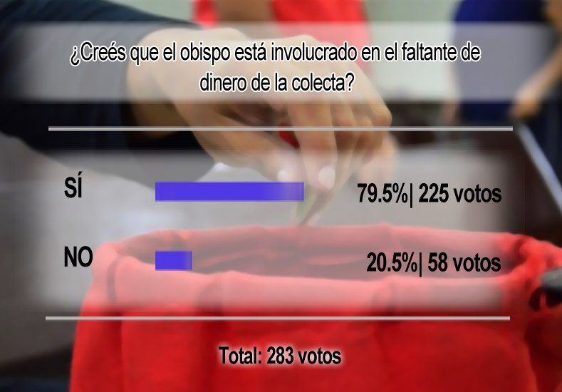 Tras el escándalo en el Arzobispado por el faltante de $700 mil de dinero de ofrenda, los lectores de sanjuan8.com se expresaron en contra de Monseñor Alfonso Delgado, opinando que no le creen que desconocía el tema que denunció. De un total de 283 votos, el 79.5% opinó que descree al principal representante de la Iglesia Católica en San Juan.
