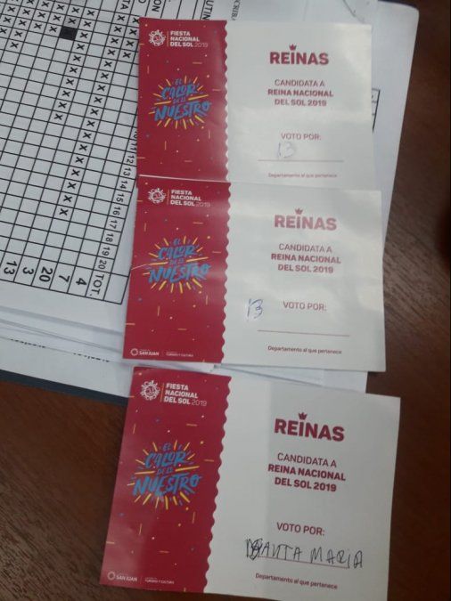 Gómez fue muy clara al mostrar y explicar que los tres votos impugnados no cambiaban el resultado final de Reina y Virreina del Sol. "De los tres votos impugnados, uno tenía consignado el nombre de la candidata de Calingasta, lo cual viola el reglamento ya que solo debía figurar el departamento representando, y en los otros dos figuraba solo un número, el 13. Si bien las candidatas no llevaban número, en caso de guiarse por el orden de aparición eso votos hubiesen sido para la representante de San Martín", mencionó la escribana.