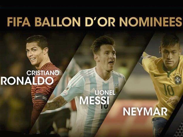 El astro argentino Lionel Messi competirá por su quinto Balón de Oro al mejor jugador del mundo en una temporada con el portugués Cristiano Ronaldo, ganador de la estatuilla los últimos dos años, y el brasileño Neymar, su compañero de ataque en Barcelona de España, tras divulgar este lunes la FIFA las ternas de la gala que se realizará en Zúrich en enero próximo.