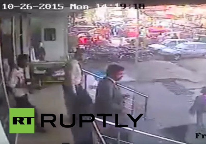 Las cámaras de un circuito cerrado de televisión han captado el sobrecogedor momento en el que decenas de personas se mantienen en cuclillas para intentar mantener el equilibrio o directamente caen el suelo en Pakistán ante el violento temblor del terremoto de magnitud 7,5 registrado este lunes'.