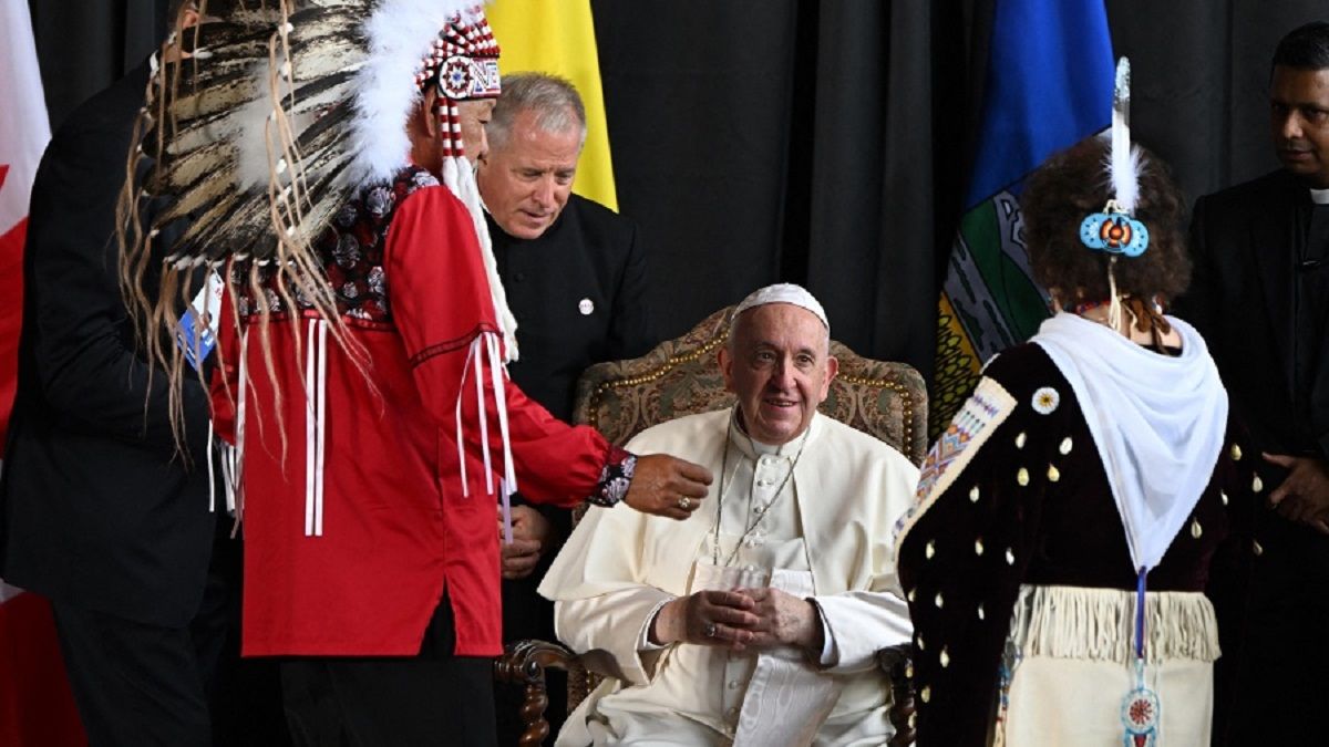 Antes de iniciar su discurso, el Papa presenció los cantos y bailes de los pueblos indígenas que llegaron al parque de Maskwacis con trajes ancestrales y escuchó el agradecimiento de uno de los caciques, Wilton Litllechild, quien asistió 14 años al internado de Ermineskin.
